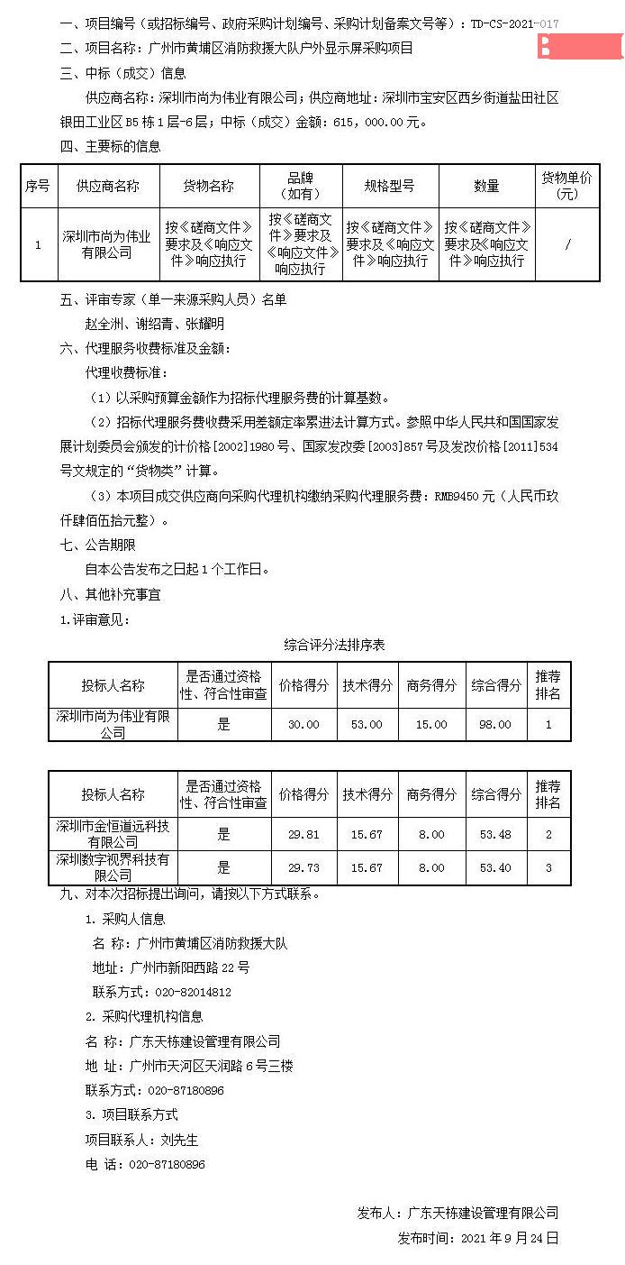 廣州市黃埔區(qū)消防救援大隊戶外顯示屏采購項目成交結果公告